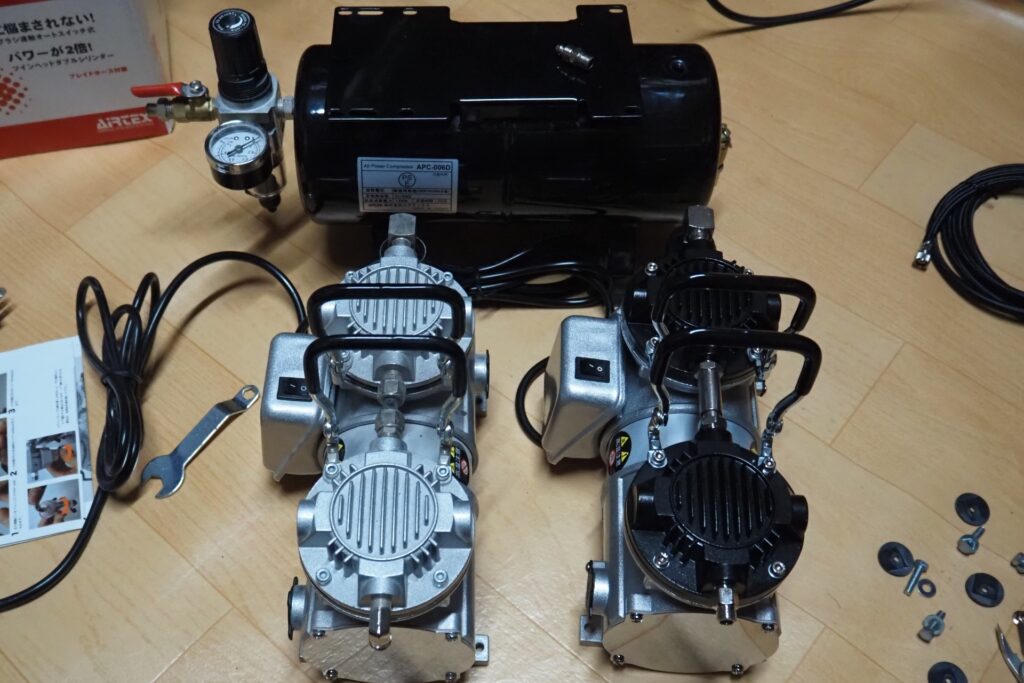 これまで使用していた、エアテックスのエアタンク付きコンプレッサーAPC006Dが壊れたため、同じメーカーのAPC005Dを買って取り付けました。